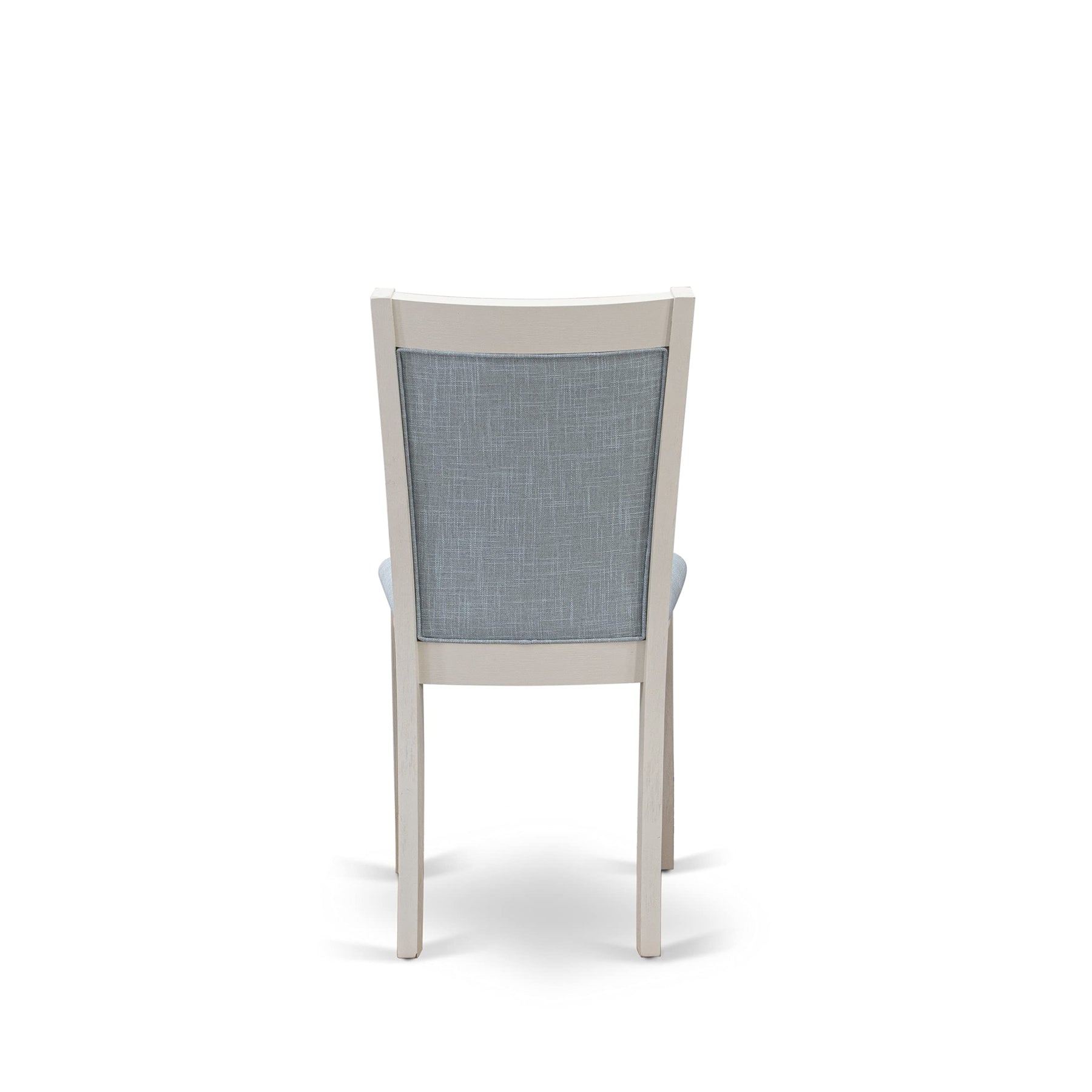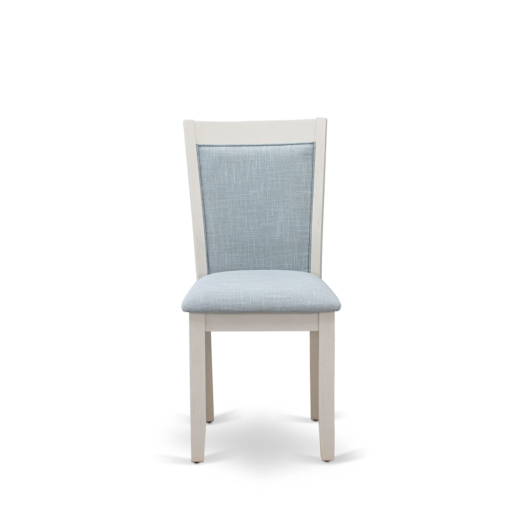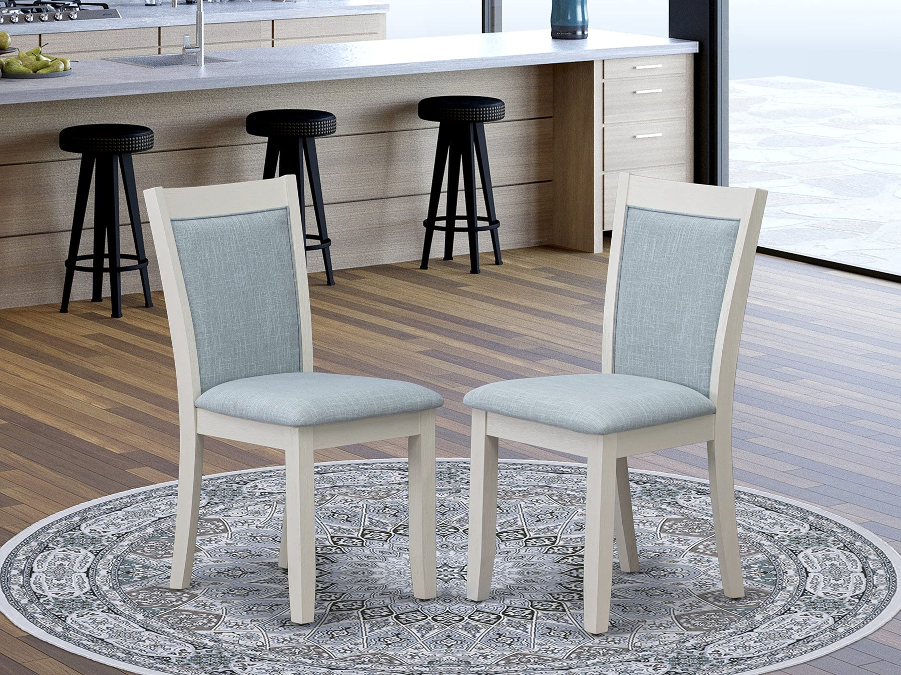 EAST WEST FURNITURE - MZC0T15 - DINING CHAIR SET OF 2Enhance your dining room or kitchen area with this set of 2 kitchen chairs, providing both comfort and aesthetic appeal. These dining chairs make a fantastic addition to any home. With a Baby Blue Linen Fabric seat, a High Chair Back, and Wire Brushed Linen White Wooden 4 Legs, this dining chair boasts a contemporary design that effortlessly complements any color scheme and adds a beautiful touch to your dining room. The frame of the dining chair is crafted from robust Asian wood, specifically Rubber Wood, renowned for its durability to withstand years of use. Thanks to their traditional style, our kitchen chairs effortlessly blend with any room decor. Furthermore, this exquisite dining chair exudes elegance while seamlessly integrating with various room designs. The combination of contemporary Linen Fabric and a warm wood seat creates a sophisticated yet casual ambiance. These mid-century chairs offer a comfortable seating experience along with sturdy support. They are reliable enough to accommodate your daily needs, with a load-bearing capacity of 300 lb. Cleaning the dining room chairs is a breeze, as they always maintain a fresh appearance. A simple wipe with a damp cloth quickly removes dust and restores their pristine condition.PRODUCT FEATURES: Wood Material: Asian Wood Fabric type: Linen Fabric Fabric Color: Baby Blue Chair Legs Finish: Wire Brushed Linen White Chair Dimensions: Length: 19.5; Width: 17.7; Height: 36.8.8Package includes: Linen Fabric Dining Room Chairs